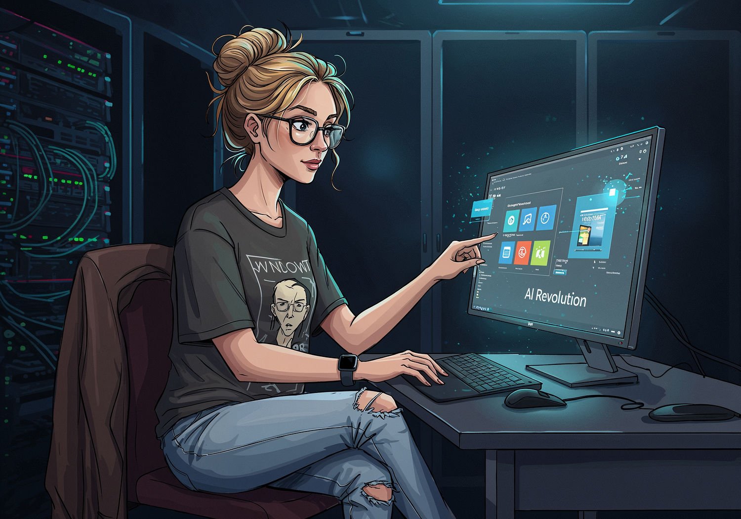 Woman in an oversized graphic t-shirt featuring a tech-related meme, high-waisted distressed jeans,