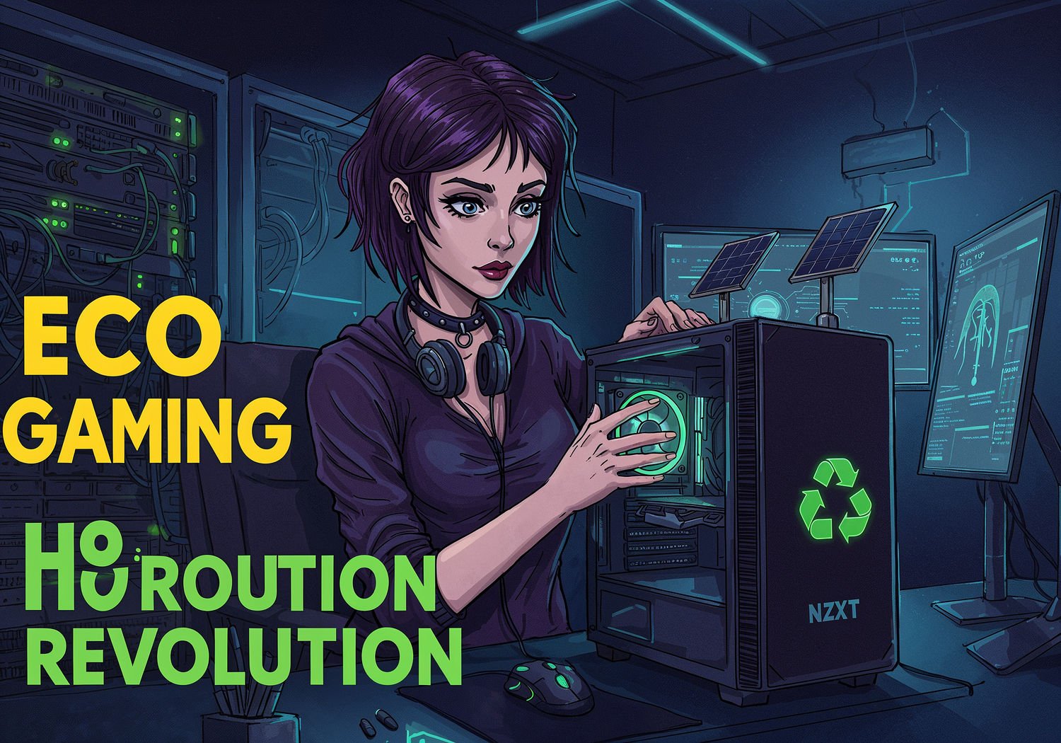Woman in in gothic and tech-related clothing, Woman assembling an eco-friendly NZXT H9 Flow PC case made from recycled materials, with integrated solar panels on top charging gaming peripherals like a mouse and keyboard, surrounded by green recycling symbols and sustainable tech elements in a modern gaming setup. The text reads in large bold font with bright yellow outline on letters, using a clean professional typeface: 'Eco Gaming Revolution’