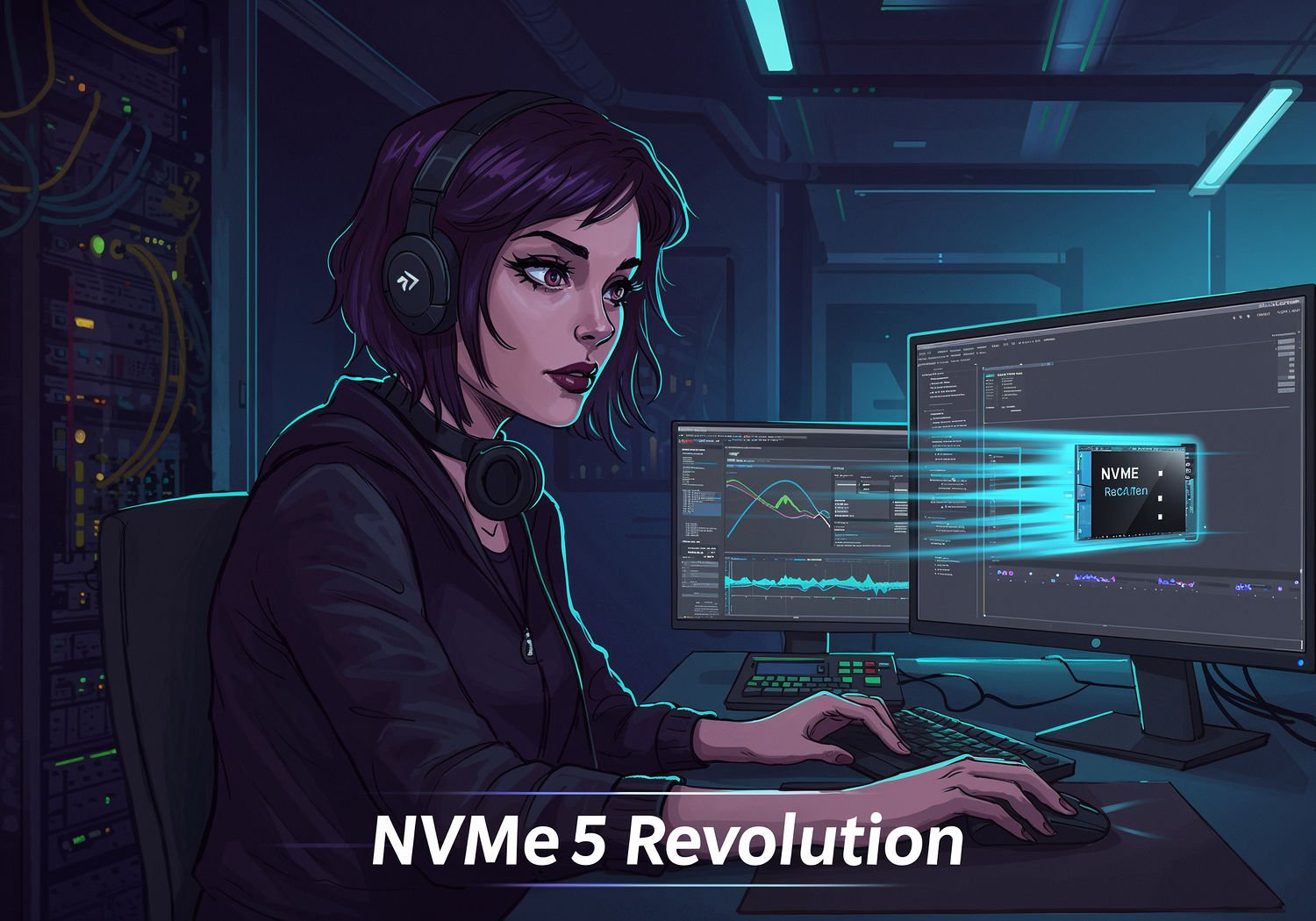 Woman in in gothic and tech-related clothing, Woman at a modern workstation editing 4K video on a computer with NVMe Gen5 SSD, timeline scrubbing smoothly without lag, high-speed data streams visualized as glowing blue lines flowing rapidly from the drive to the screen, professional creative environment with monitors displaying video assets. The text reads: 'NVMe Gen5 Speed Revolution’ in large bold font with bright yellow outline on letters, professional sans-serif typeface.