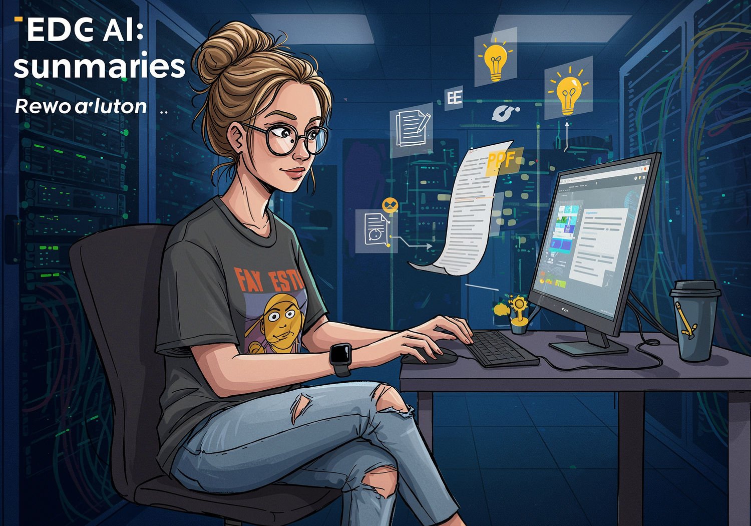 and vintage sneakers, a smartwatch on her wrist; Woman at a modern desk using a computer with Microsoft Edge browser open, viewing a long PDF document on screen as AI generates a concise summary in a sidebar, surrounded by floating icons of documents and efficiency symbols like clocks and lightbulbs, conveying productivity and time-saving innovation. The text reads: 'Edge AI: PDF Summaries Revolution’ in large bold font with bright yellow outline on letters, readable professional typeface.