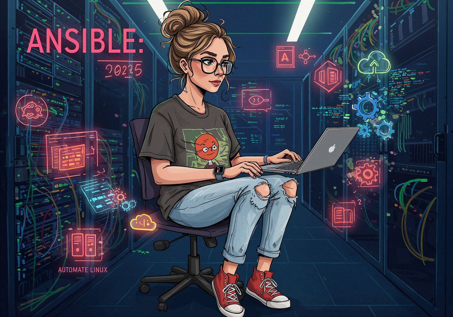 and vintage sneakers, a smartwatch on her wrist; Woman at a Linux workstation, surrounded by floating icons of servers, cloud platforms, code scripts, and gears representing automation, with Ansible playbook elements integrating seamlessly. The text reads: 'Ansible 2025: Automate Linux’ in large professional sans-serif font, burgundy letters with bright yellow outline.