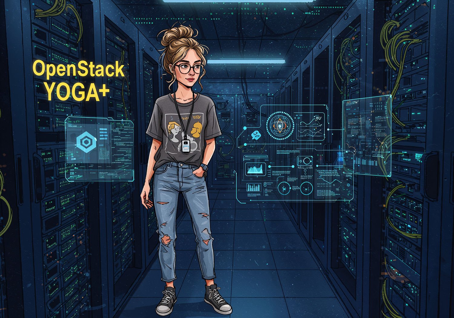 and vintage sneakers, a smartwatch on her wrist; Woman standing at the center of a futuristic private cloud data center, overseeing automated server deployments with glowing holographic interfaces showing virtual machines provisioning instantly, interconnected blockchain chains linking audit logs in a secure, transparent network of nodes and data flows. The text reads: 'OpenStack Yoga+’ in large bold font with bright yellow outline on letters, professional readable typeface.