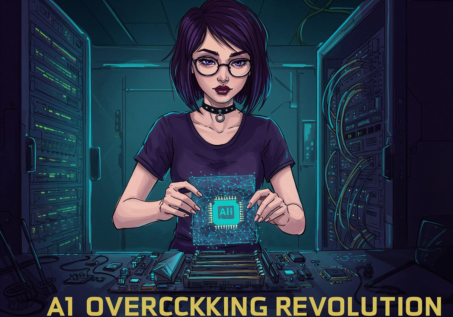 Woman in in gothic and tech-related clothing, Woman as central figure confidently assembling a high-end PC motherboard with glowing AI neural network overlays and overclocking indicators on a futuristic workbench, surrounded by components like CPU, DDR5 RAM, and PCIe slots, evoking innovation and stability for PC enthusiasts. The text reads: 'AI Overclocking Revolution’ in large bold font with bright yellow outline on letters, using a clean professional typeface.