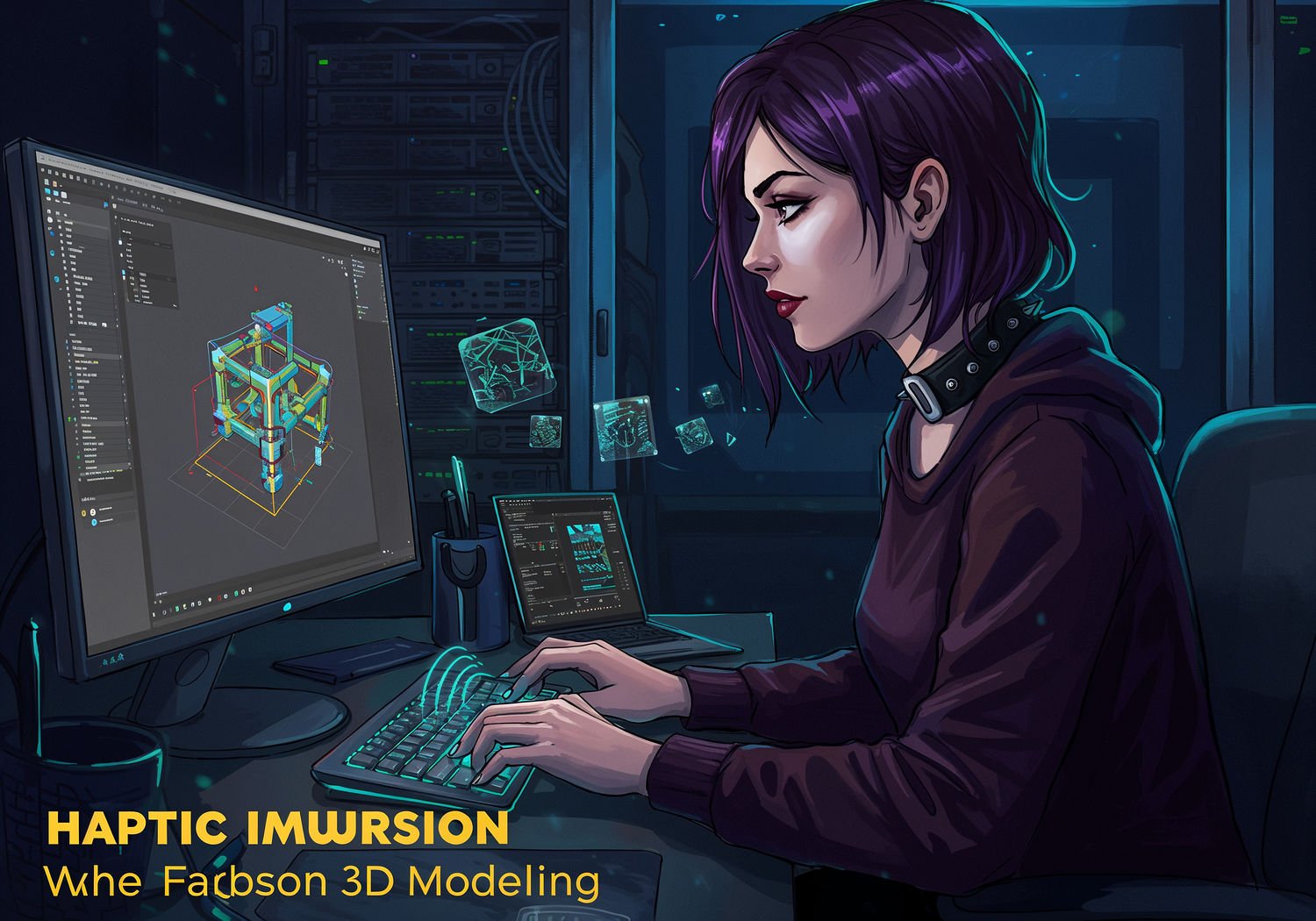 Woman in in gothic and tech-related clothing, Woman at a modern workstation desk, intensely focused on a large computer screen displaying a detailed 3D model in Blender, her hands typing on a haptic feedback keyboard with subtle vibration effects visualized as glowing waves emanating from the keys, surrounded by creative tools like a mouse and stylus, immersive atmosphere with soft digital glows and virtual textures floating nearby. The text reads in large bold font with light yellow outline and professional readable typeface: 'Haptic Immersion in 3D Modeling’