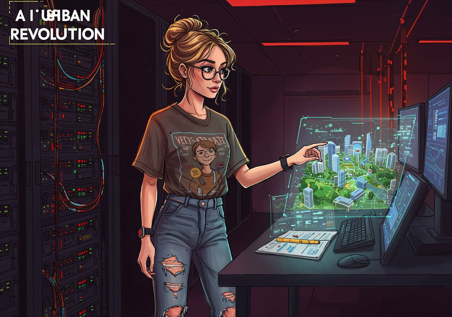 and vintage sneakers, a smartwatch on her wrist; Woman standing at a futuristic urban planning desk, interacting with a holographic interactive AI-generated city map displaying real-time data streams of traffic, green spaces, and building simulations in a vibrant smart city environment. The text reads: 'AI Urban Revolution’ in large bold font with bright yellow outline on letters, using a clean professional typeface.