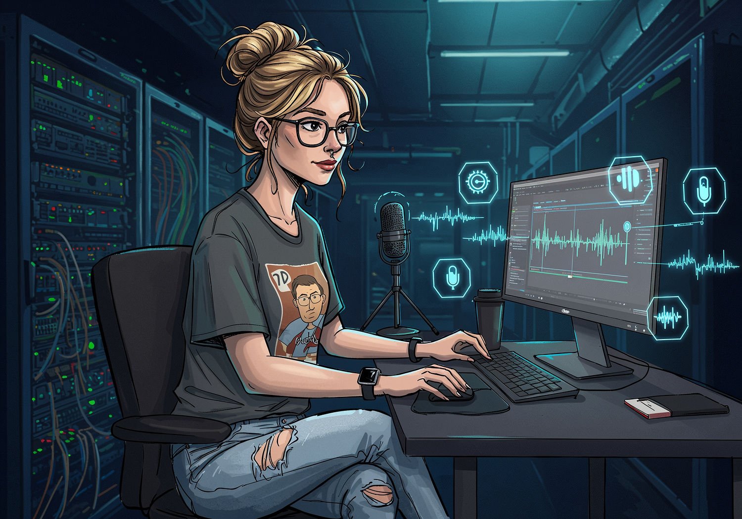 and vintage sneakers, a smartwatch on her wrist; Woman at a modern desk editing a podcast in Audacity software on a computer screen, surrounded by floating audio waveforms, microphone, and glowing AI neural network icons representing machine learning effects like noise reduction and voice enhancement. The text reads: 'Audacity 4.0 AI Revolution’ in large bold font with bright yellow outline on letters, professional readable typeface.