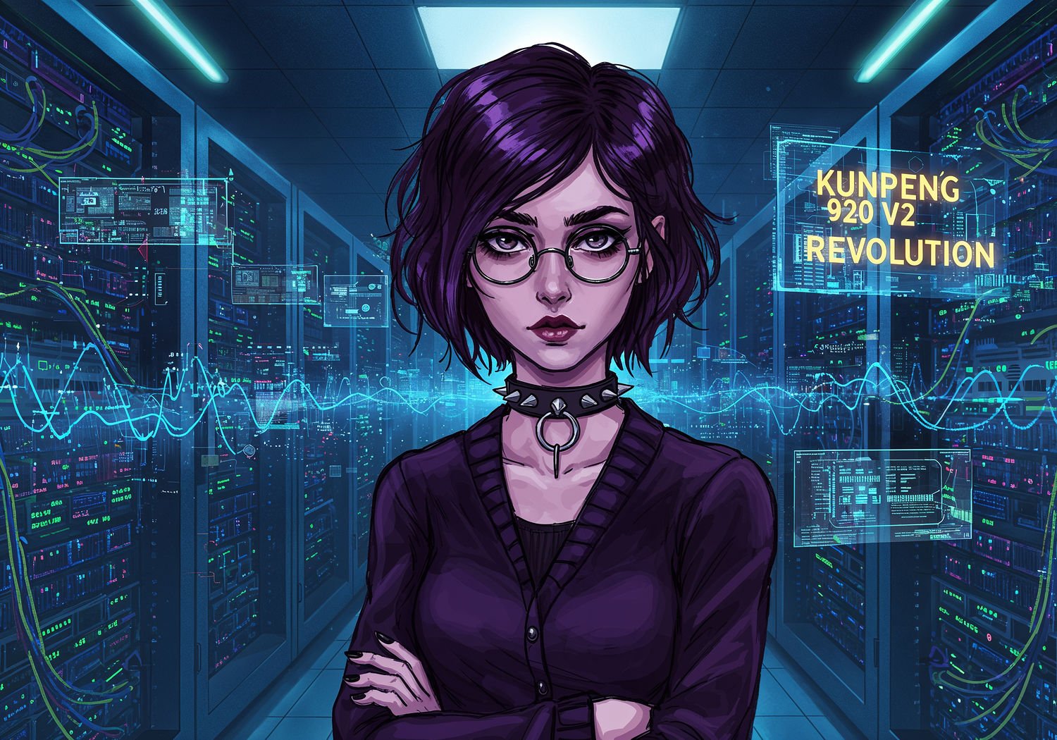 Woman in in gothic and tech-related clothing, Woman standing confidently in a futuristic data center, surrounded by glowing servers and cascading 5G network waves, holographic displays showing ARM processors and high-speed data flows. The text reads in large font with maroon letters, bright yellow outline, and clear professional typeface: 'Kunpeng 920 v2 Revolution’