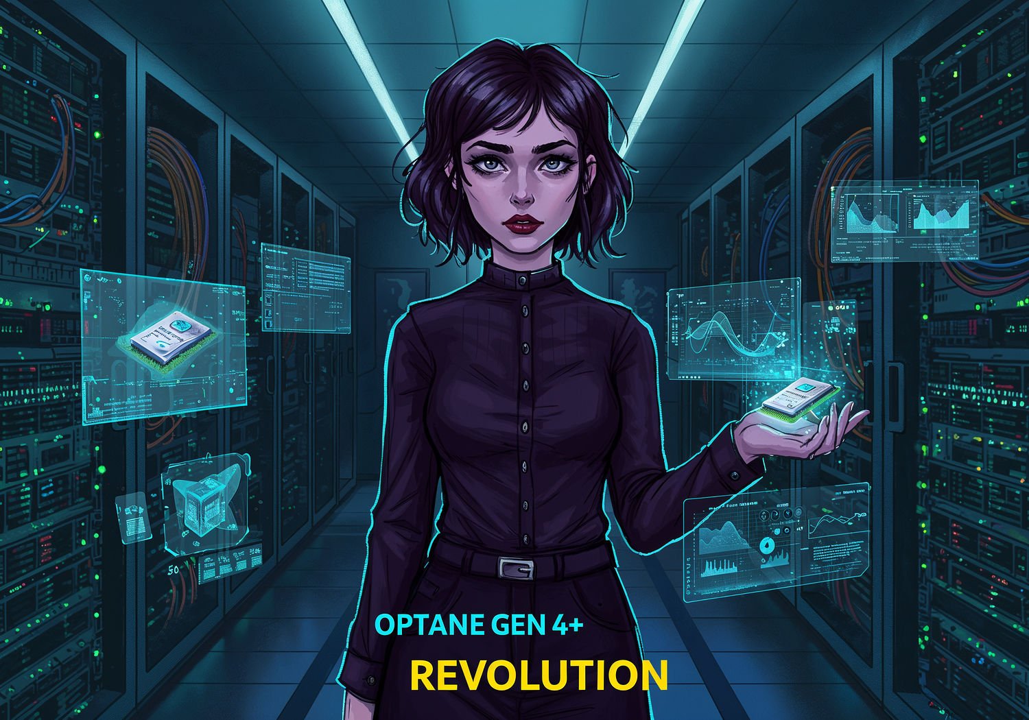 Woman in in gothic and tech-related clothing, Woman standing at the center of a futuristic data center, surrounded by glowing server racks with Intel Optane Gen 4+ modules, holographic displays showing accelerating climate simulations and genomic data streams, beams of light representing enhanced caching and high-speed computations bridging RAM and storage. The text reads in large bold font with bright yellow outline on letters, using a readable professional font: 'Optane Gen 4+ Revolution’