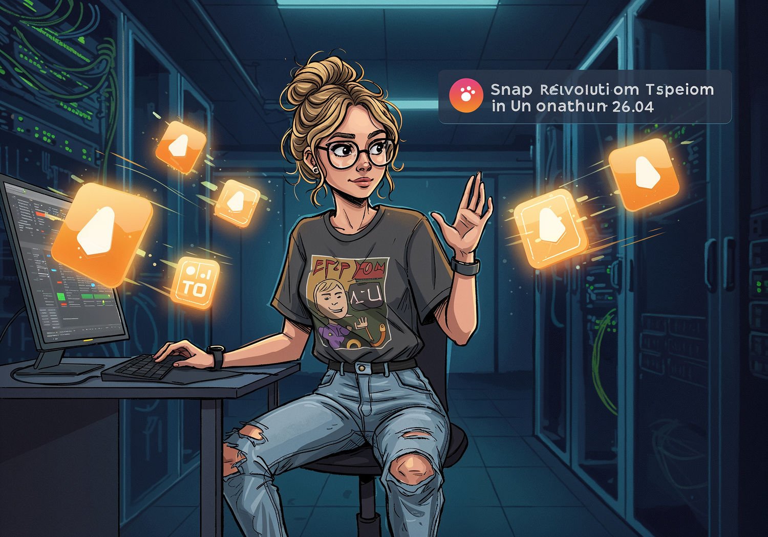 and vintage sneakers, a smartwatch on her wrist; Woman at a computer desk installing software effortlessly on Ubuntu Linux, surrounded by glowing Snap package icons floating like containers, symbolizing easy and revolutionary app management, with futuristic speed lines indicating faster updates and stability. The text reads: 'Snap Revolution in Ubuntu 26.04′ in large bold font with light yellow outline on letters, using a readable professional typeface.