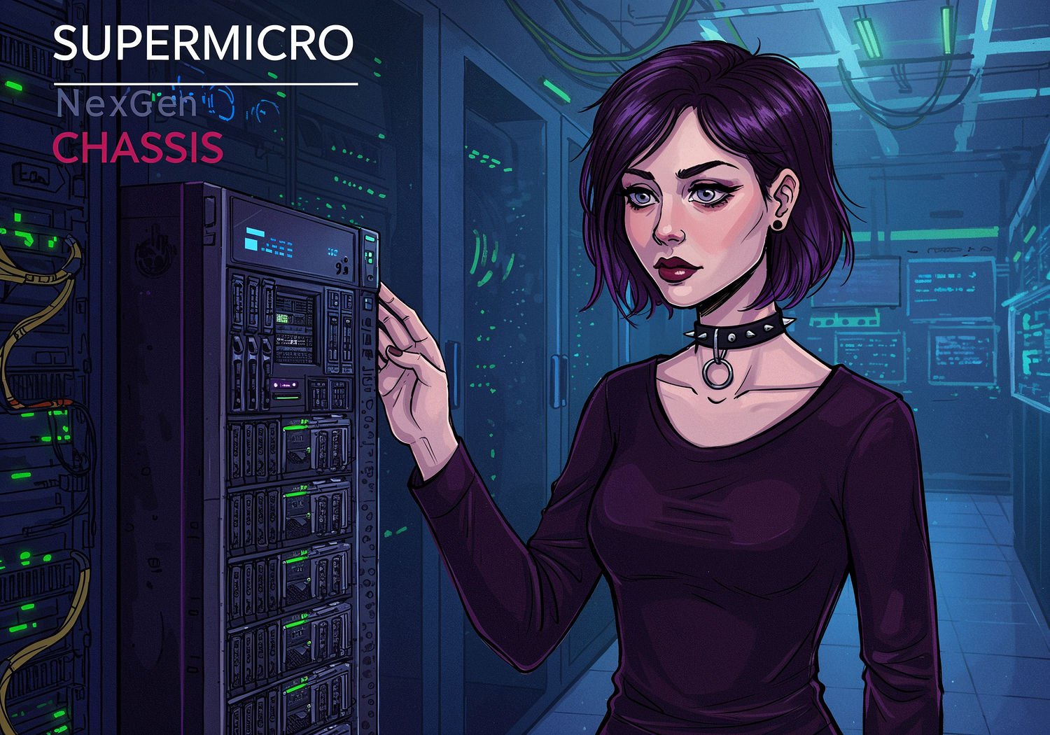Woman in in gothic and tech-related clothing, Woman standing confidently in a high-tech data center, examining a sleek 4U rackmount server chassis from Supermicro with visible redundant 80 PLUS Titanium PSUs, optimized airflow vents, and multiple GPU cards, symbolizing reliability and efficiency for AI and HPC applications. The text reads: 'Supermicro NextGen Chassis’ in large bold maroon font with bright yellow outline, readable professional typeface.