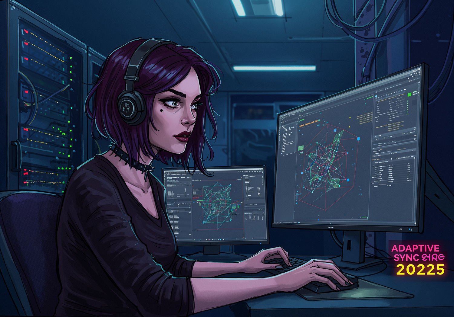 Woman in in gothic and tech-related clothing, Woman at a futuristic workstation in 2025, intensely focused on a large monitor displaying a seamless 3D CAD model rendering without stuttering or latency, surrounded by high-tech elements like NVIDIA and AMD logos, emphasizing adaptive sync evolution for professional productivity. The text reads: 'Adaptive Sync 2025′ in large bold font with light yellow outline, professional sans-serif typeface.