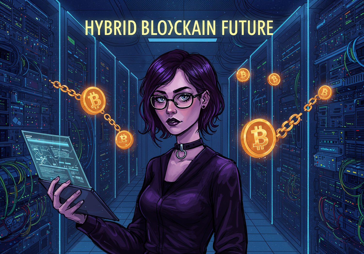 Woman in in gothic and tech-related clothing, A futuristic scene of a woman standing centrally in a high-tech server farm, surrounded by glowing hybrid Bitmain servers integrating PoW and PoS mechanisms, with energy-efficient lights and blockchain symbols like chains and coins floating around, evoking innovation and sustainability in 2025 cryptocurrency mining. The text reads: 'Hybrid Blockchain Future’ in large bold font with bright yellow outline on letters, using a clean professional typeface.